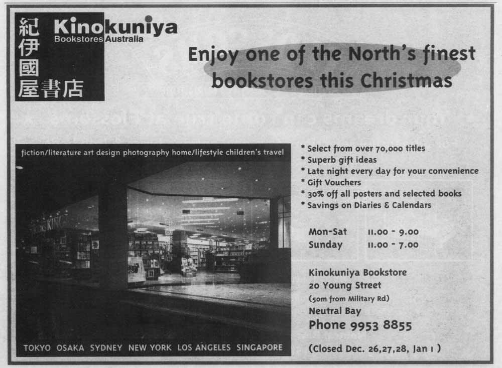 In the late 1990s until 2002, Kinokuniya was located at 20 Young St, Neutral Bay (where Pet Barn is now located).