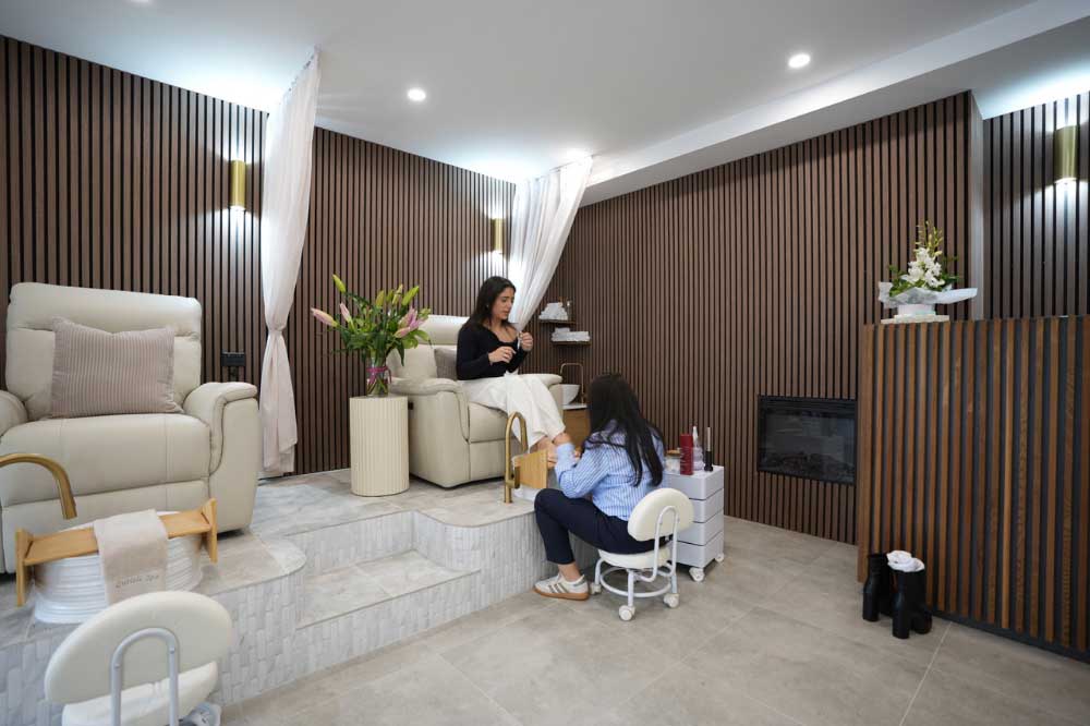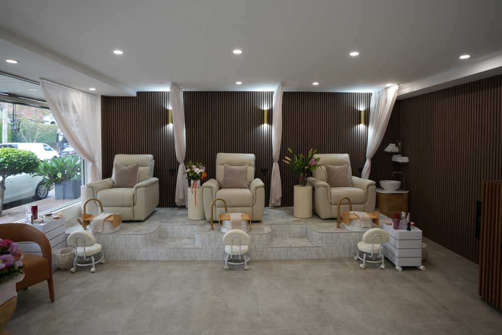 Gone are the utilitarian chopping blocks and chest fridges. In their place, three opulent pedicure thrones, gleaming brass tapware, luxurious ivory-leather recliners, and floor-to-ceiling sheer drapery.
