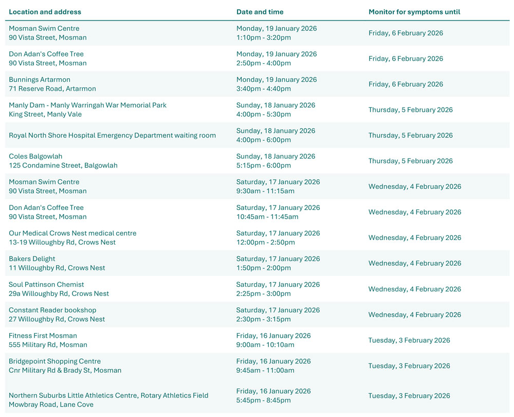 Measles Alert: Mosman, Crows Nest, Lane Cove and Balgowlah listed in urgent warning.
