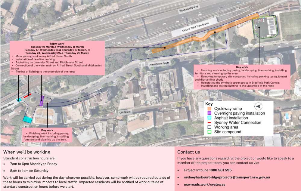 Day works include minor paving, removal of the temporary site compound, packing up equipment and dismantling sheds, reinstating the synthetic green grass in Bradfield Park Central, and installing and testing lighting beneath the ramp.