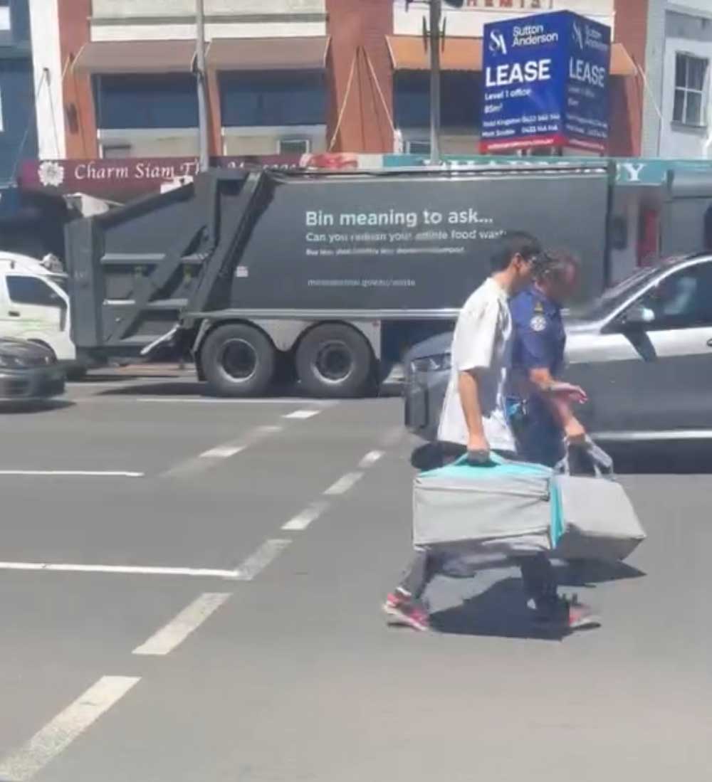 A local man helps a Paramedic with equipment during the medical emergency on Military Rd, Neutral Bay.