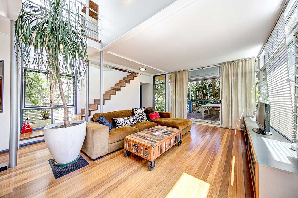 With two levels, featuring living and dining downstairs and cleverly designed large bedrooms upstairs, the home is a haven of light, space, and privacy.